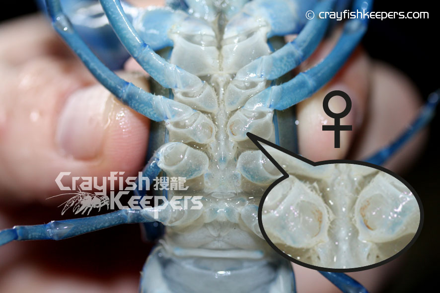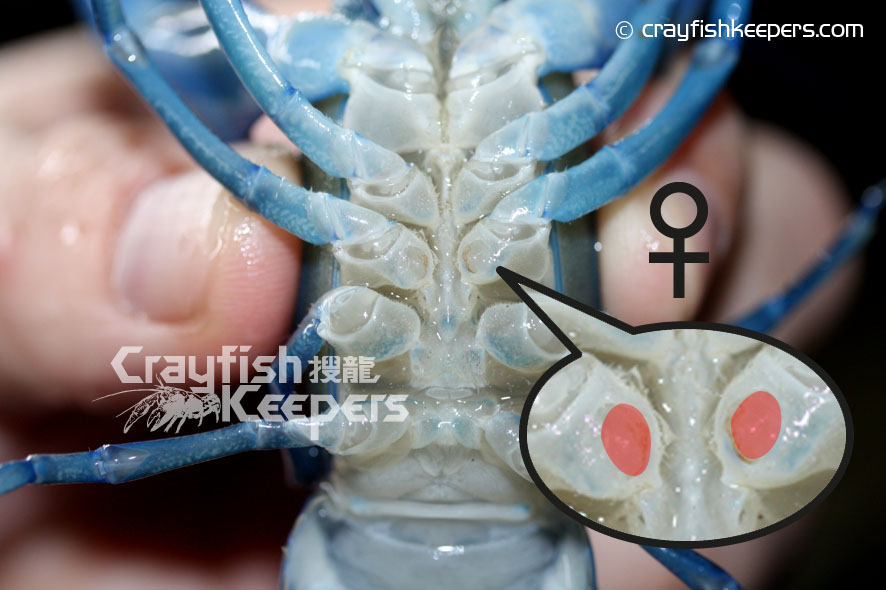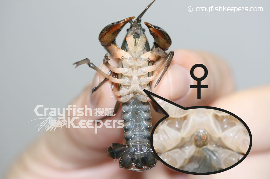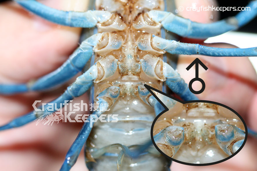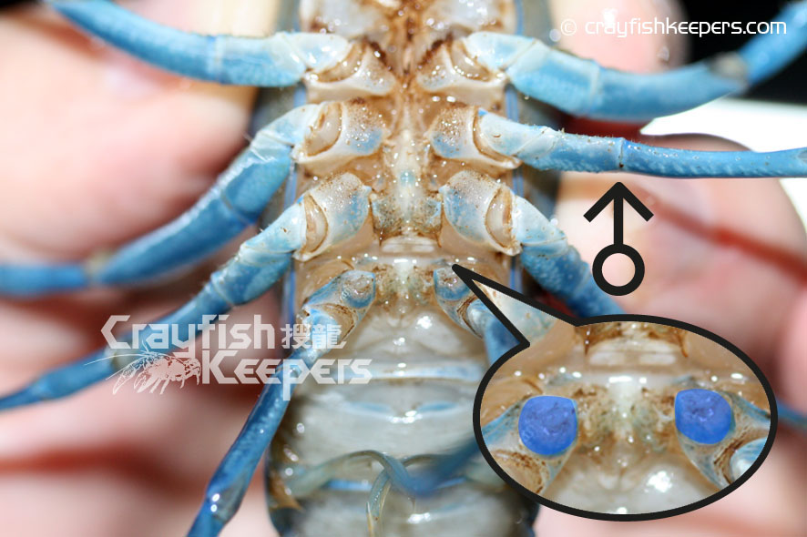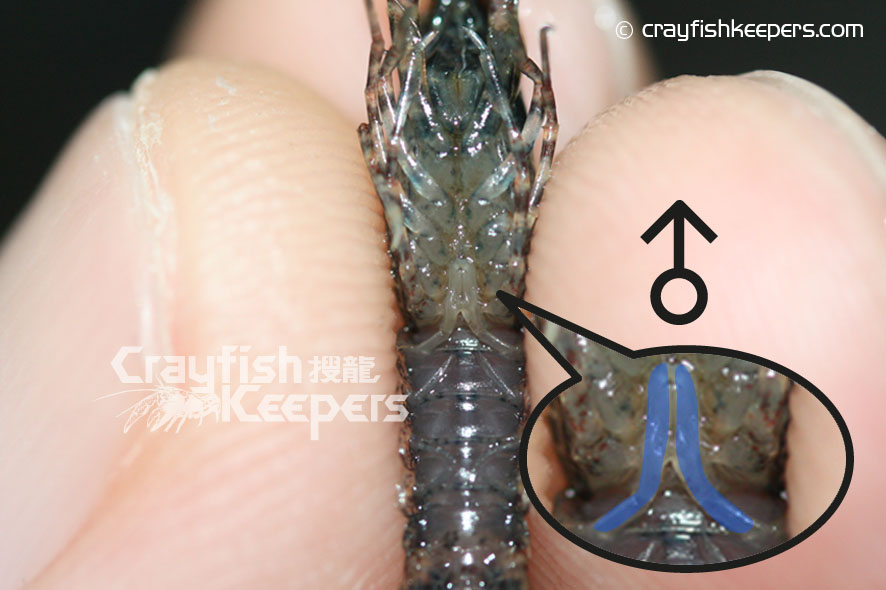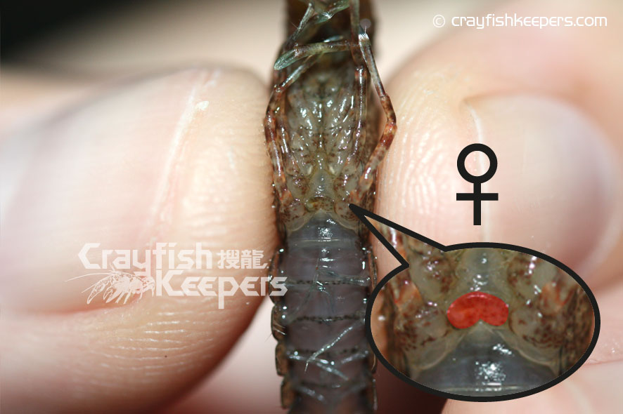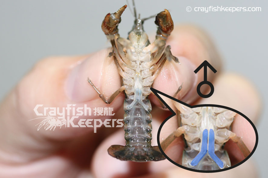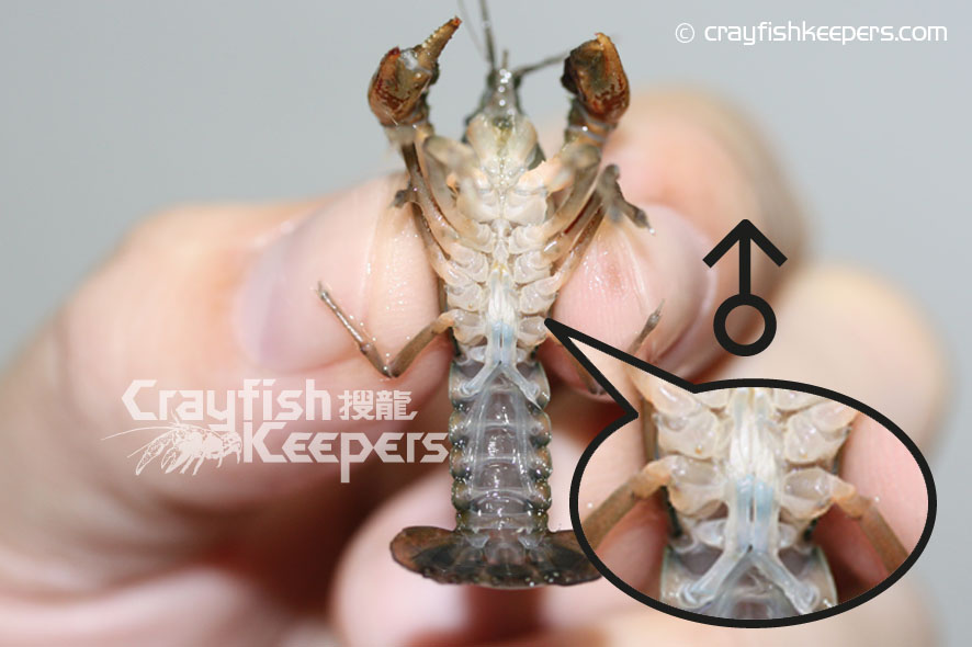 要鑑定螯蝦的性別,最準確的方法是看看牠們位於底部的生殖器,對於大部份螯蝦如Cambarus Procambarus 和迷螯Cambarellus等品種都能在第四、五對步足之間找到明顯的性徵,雄性在泳足上排有一對輸送精子的交尾器Gonopod,而雌性則有一個接收精子的儲精囊annulus ventrials(sperm receptacle),基本上從兩者之間明顯的性徵便能輕易分別出螯蝦的性別。但對於像Cherax屬的品種卻較難分別,雄性的的交尾器長在第五對步足近身體的部位,程現兩處凸起的小鉤狀,至於雌性則在第三重對步足近身體的部位有兩處程圖形的小孔就是生殖孔Gonoporen。對於太小的螯蝦幼體來說,不論任何品種,由於性徵還未明顯,單靠肉眼是無法準確分別的,而成體我們往往能從牠們的鉗形大小和尾部的寬度分別得到。