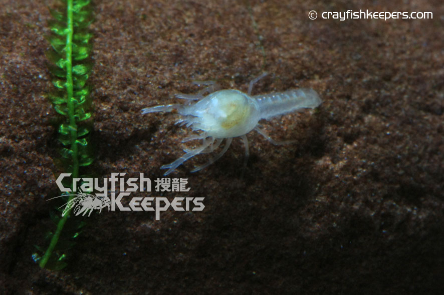 這隻小白美螯天生就沒有了眼睛,將要活在黑暗的世界裡,靠觸覺感應生存下去! 這令我想起一種沒有眼睛的螯蝦,牠們長年活在沒光線和充滿毒氣的礦洞內,由於礦洞內沒有光線,體色已退化至半透明狀,成長速度也極度緩慢,其中一些品種更推算可活至過百歲!